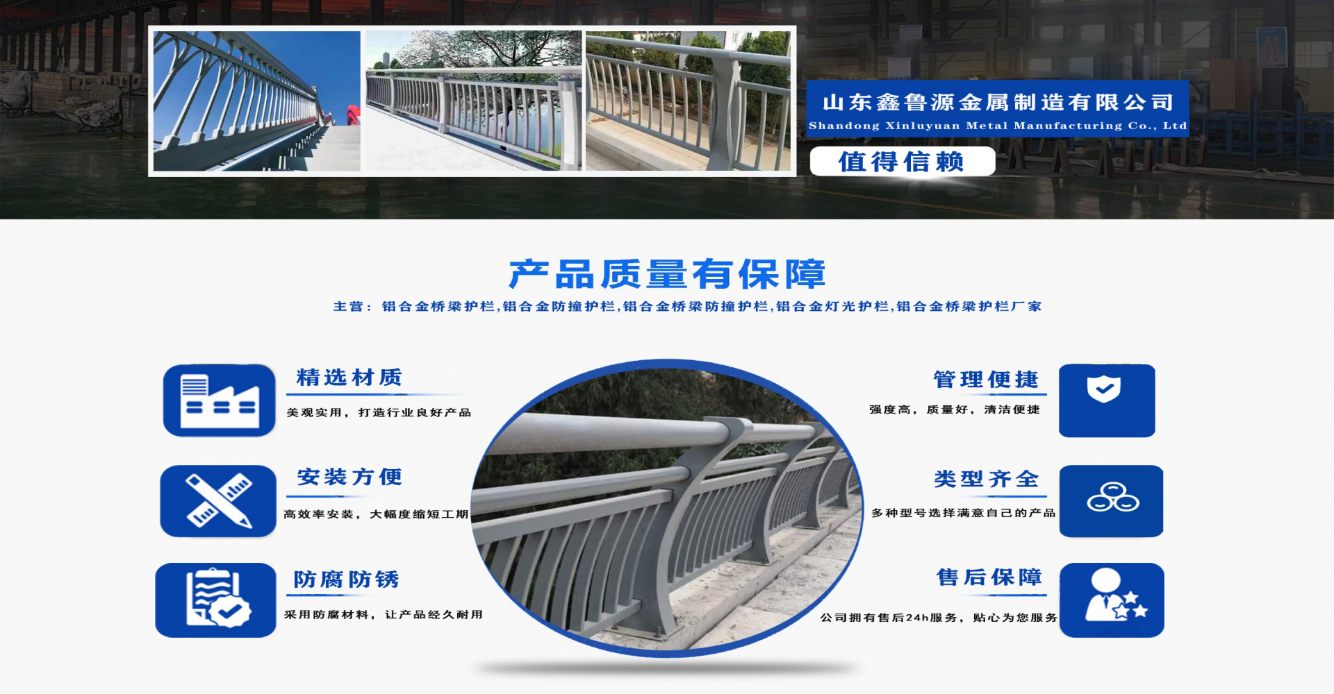 山東鑫魯源金屬制造有限公司主要經(jīng)營:鋁合金橋梁護欄,鋁合金防撞護欄,鋁合金橋梁防撞護欄,鋁合金燈光護欄,不鋁合金橋梁護欄廠家,環(huán)波梁橋梁護欄,環(huán)波梁防撞護欄。質(zhì)量可靠、經(jīng)濟實用的顯著特點。公司為客戶提供可靠售后保障,堅持“以品質(zhì)立足、服務(wù)求發(fā)展”,愿與各界朋友精誠合作、攜手發(fā)展! 服務(wù)優(yōu)勢:真誠的服務(wù)理念、完善的服務(wù)體系。公司專業(yè)力量充足;工程案例眾多、從業(yè)經(jīng)驗豐富;公司以可靠質(zhì)量的產(chǎn)品,合理的價格,完善的售后服務(wù),能夠滿足市場各個企業(yè)的需求?! ∑髽I(yè)精神:執(zhí)著追求 持續(xù)創(chuàng)新執(zhí)著追求,就是堅持不懈、堅定從容,專注于自己的事業(yè),把能做的事情做好,不斷克服困難、把握機遇,贏得未來。 持續(xù)創(chuàng)新,就是生命不息、創(chuàng)新不止,通過持續(xù)實施技術(shù)創(chuàng)新、管理創(chuàng)新、市場創(chuàng)新,獲取持續(xù)的競爭優(yōu)勢。...
